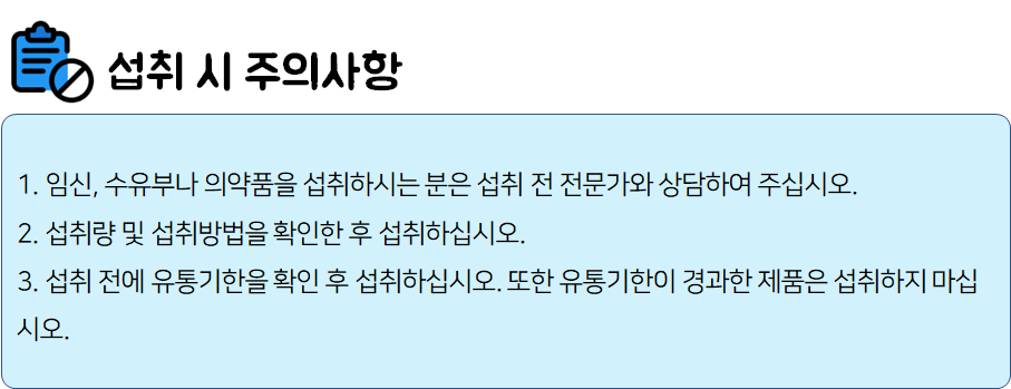 식품 섭취 도중 부작용이나 이상반응이 나타나면 섭취를 멈추고 전문가 혹은 의사와 상담하시는 것이 좋습니다.
