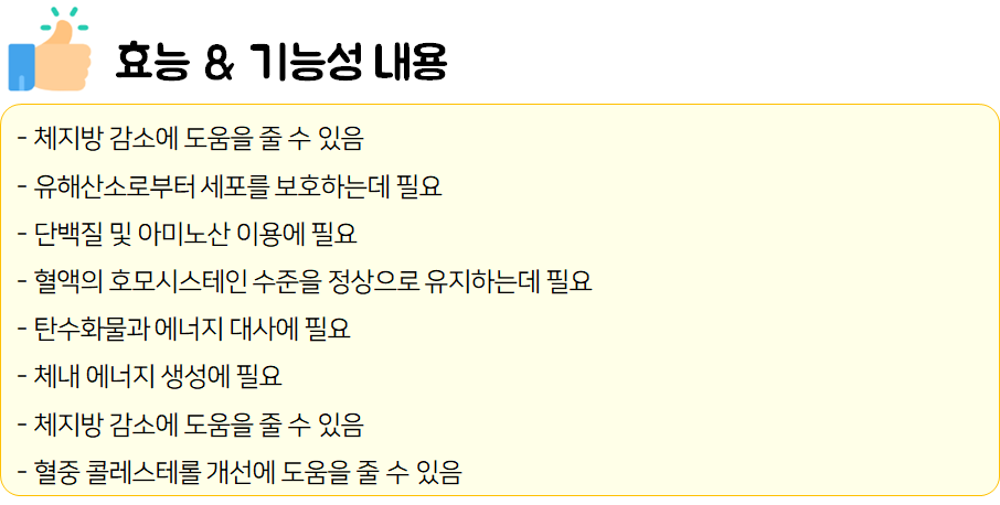 체지방 감소 / 유해산소로부터 세포 보호 / 단백질 및 아미노산 이용에 필요
