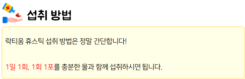이 포스팅은 락티움 휴 스틱의 성분 정보, 효능, 섭취 시 주의사항 등의 내용을 다루고 있으니 제품 섭취 전에 천천히 읽어보시고 도움 받으시길 바랍니다!