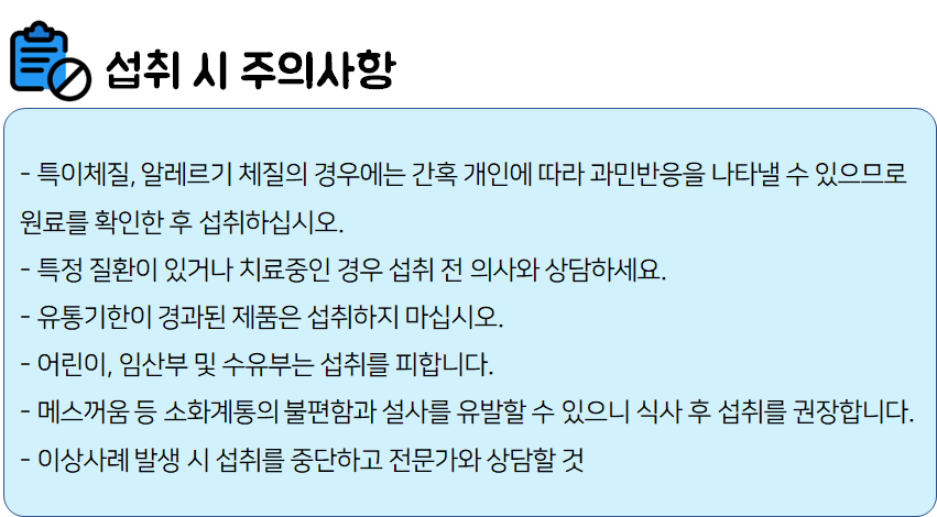 식품 섭취 도중 부작용이나 이상반응이 나타나면 섭취를 멈추시고 전문가 혹은 의사와 상담하시길 바랍니다.