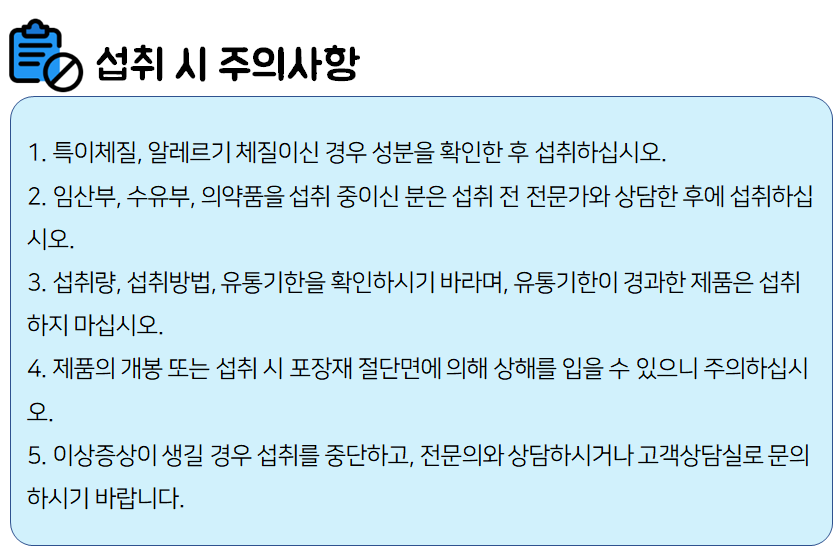 식품 섭취 도중 부작용이나 이상반응이 나타나면 섭취를 멈추시고 전문가 혹은 의사와 상담하시길 바랍니다.