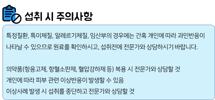 식품 섭취 도중 부작용이나 이상반응이 나타나면 섭취를 멈추고 전문가 혹은 의사와 상담하시는 것이 좋습니다.