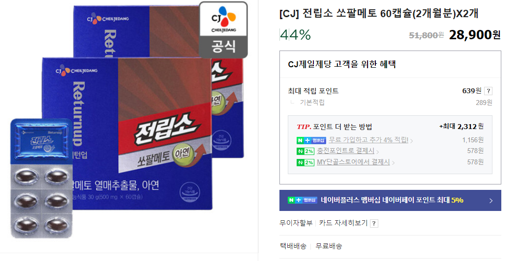 전립소 쏘팔메토는 CJ 제일제당 공식 온라인몰에서 구매할 수 있는데요, 60캡슐(2개월분) 기준 28,900원에 판매되고 있습니다.