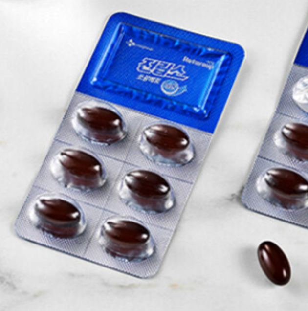 : 선명한 노란 주황색의 내용물을 함유한 갈흑색의 연질캡슐입니다.