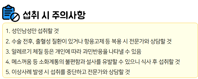 식품 섭취 도중 부작용이나 이상반응이 나타나면 섭취를 멈추시고 전문가 혹은 의사와 상담하시길 바랍니다.