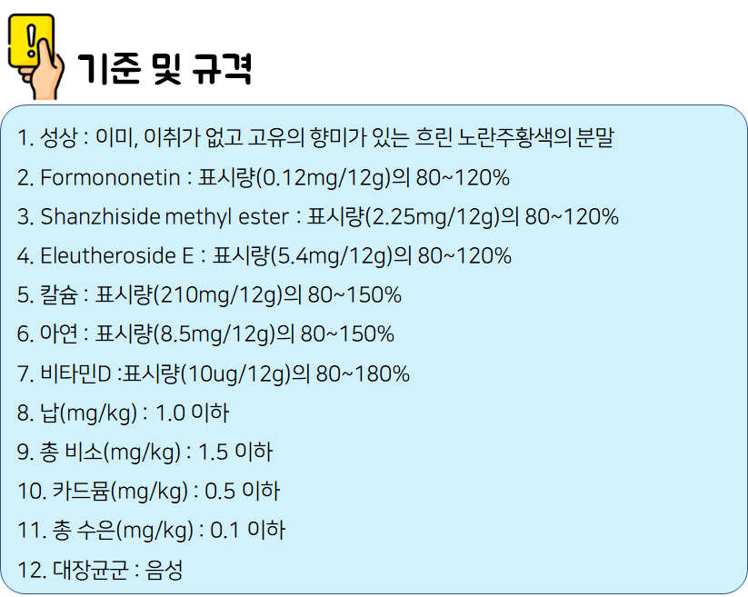 : 이미, 이취가 없고 고유의 향미가 있는 흐린 노란주황색의 분말