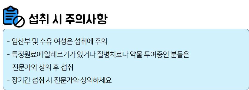 식품 섭취 도중 부작용이나 이상반응이 나타나면 섭취를 멈추시고 전문가 혹은 의사와 상담하시길 바랍니다.