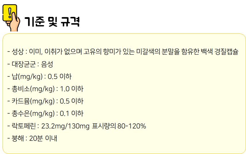 : 이미, 이취가 없으며 고유의 향미가 있는 미갈색의 분말을 함유한 백색 경질캡슐 형태