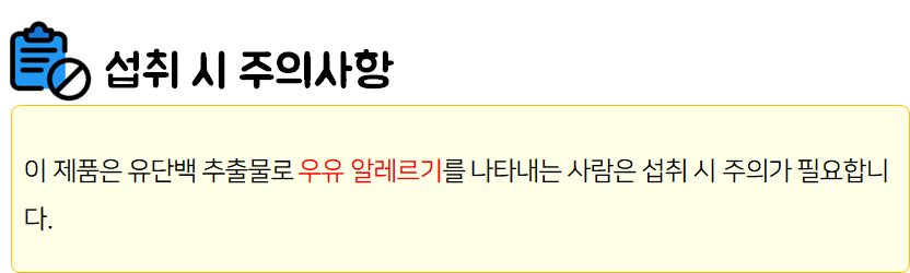 섭취 전 성분 정보 LIST를 꼼꼼히 체크하시고, 알레르기 반응을 일으키는 성분이 포함되어 있을 시, 제품 섭취를 멈추거나 or 의사, 전문가와 상담 후 섭취 지속 여부를 결정하시기 바랍니다.