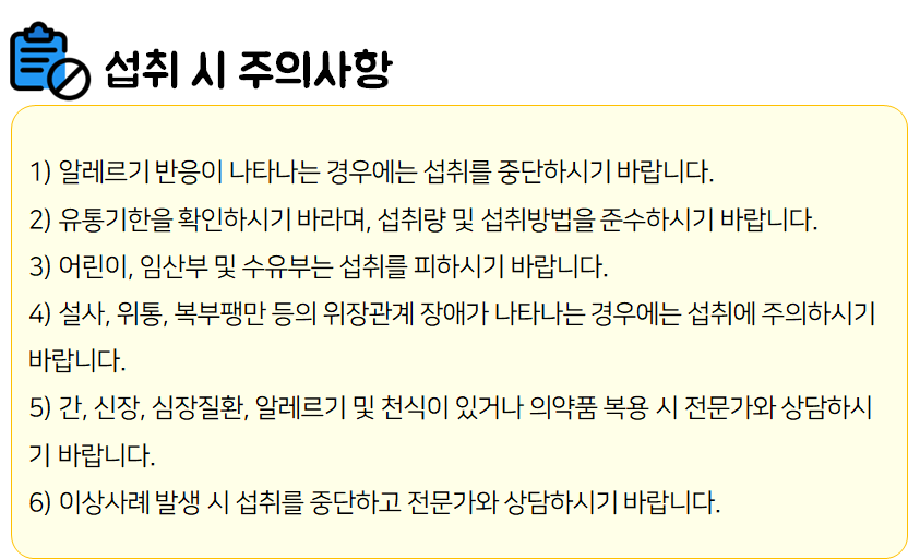 식품 섭취 도중 부작용이나 이상반응이 나타나면 섭취를 멈추고 전문가 혹은 의사와 상담하시는 것이 좋습니다.