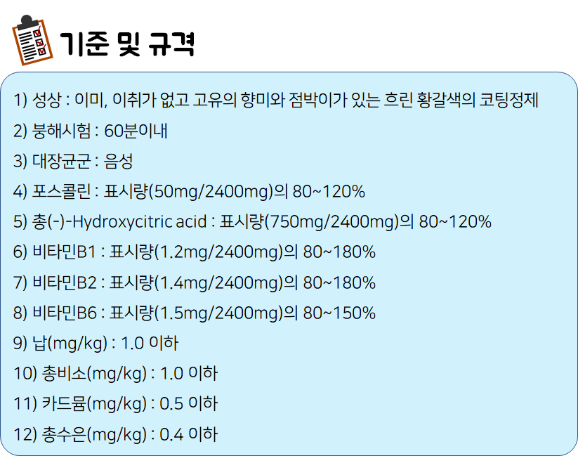 : 이미, 이취가 없고 고유의 향미와 점박이가 있는 흐린 황갈색의 코팅정제
