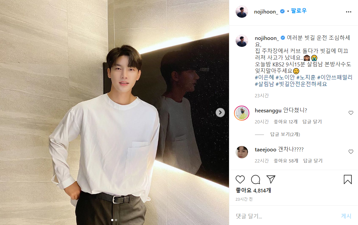 현재 노지훈의 인스타그램 계정을 통해 봤을 때 노지훈의 부상 정도는 다행히도 경미한 것으로 보입니다.
