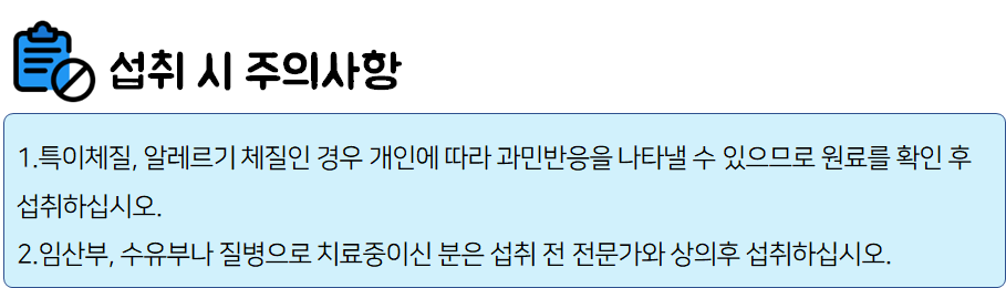 식품 섭취 도중 부작용이나 이상반응이 나타나면 섭취를 멈추시고 전문가 혹은 의사와 상담하시길 바랍니다.