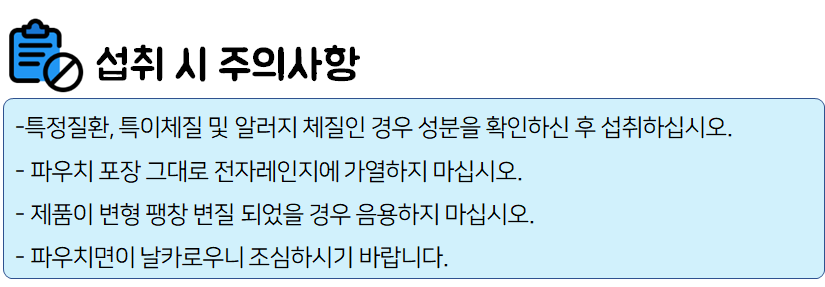 식품 섭취 도중 부작용이나 이상반응이 나타나면 섭취를 멈추시고 전문가 혹은 의사와 상담하시길 바랍니다.