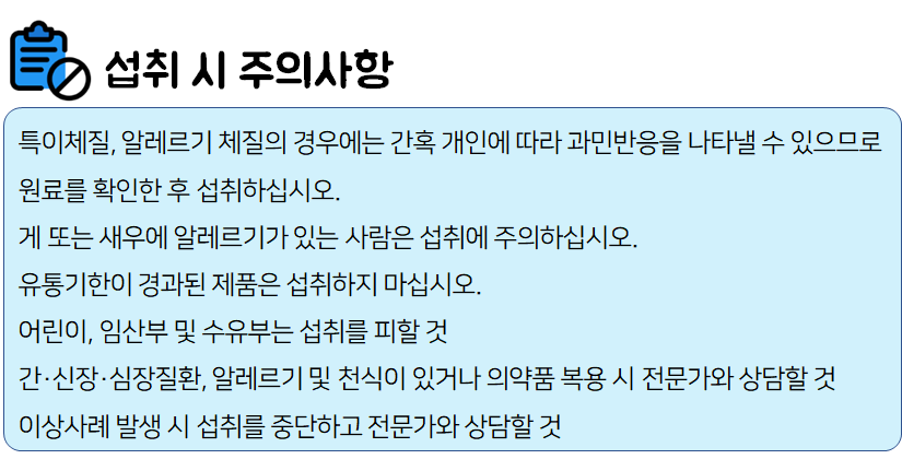 식품 섭취 도중 부작용이나 이상반응이 나타나면 섭취를 멈추시고 전문가 혹은 의사와 상담하시길 바랍니다.