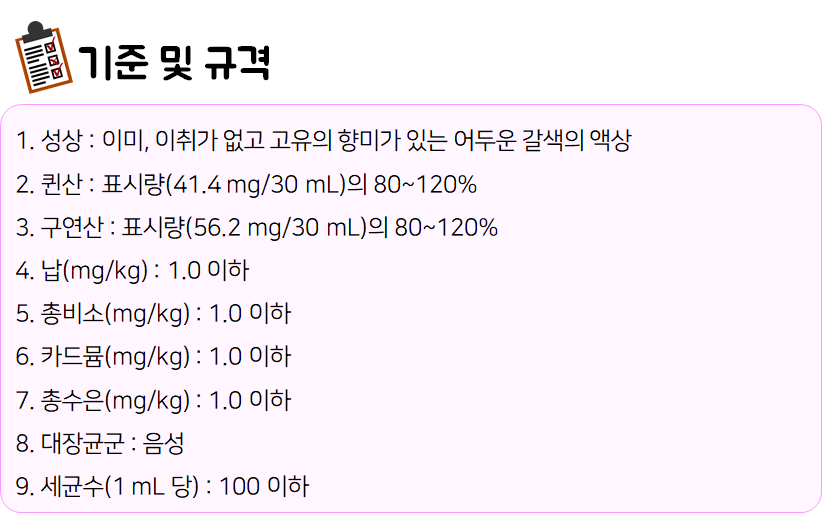 : 이미, 이취가 없고 고유의 향미가 있는 어두운 갈색의 액상